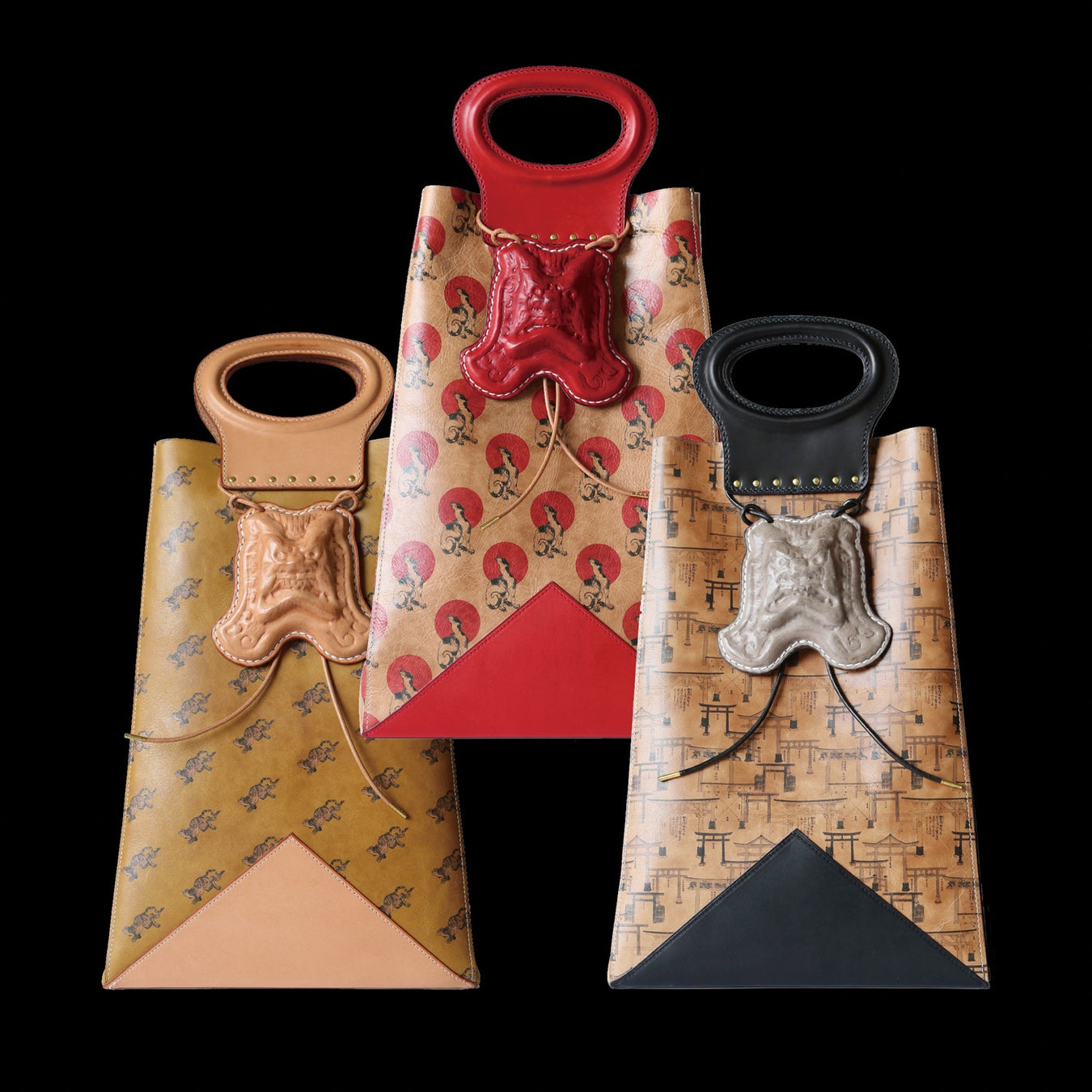 災厄いから住むものを守る「鬼瓦」を纏った大胆なデザイン。3Dプリンターで造形した型にレザーを打ち込み型出し職人の技が光るバッグです。ボディには、葛飾北斎の「北斎漫画」に登場する「奔虎」「狼と月」「鳥居」が描かれています。