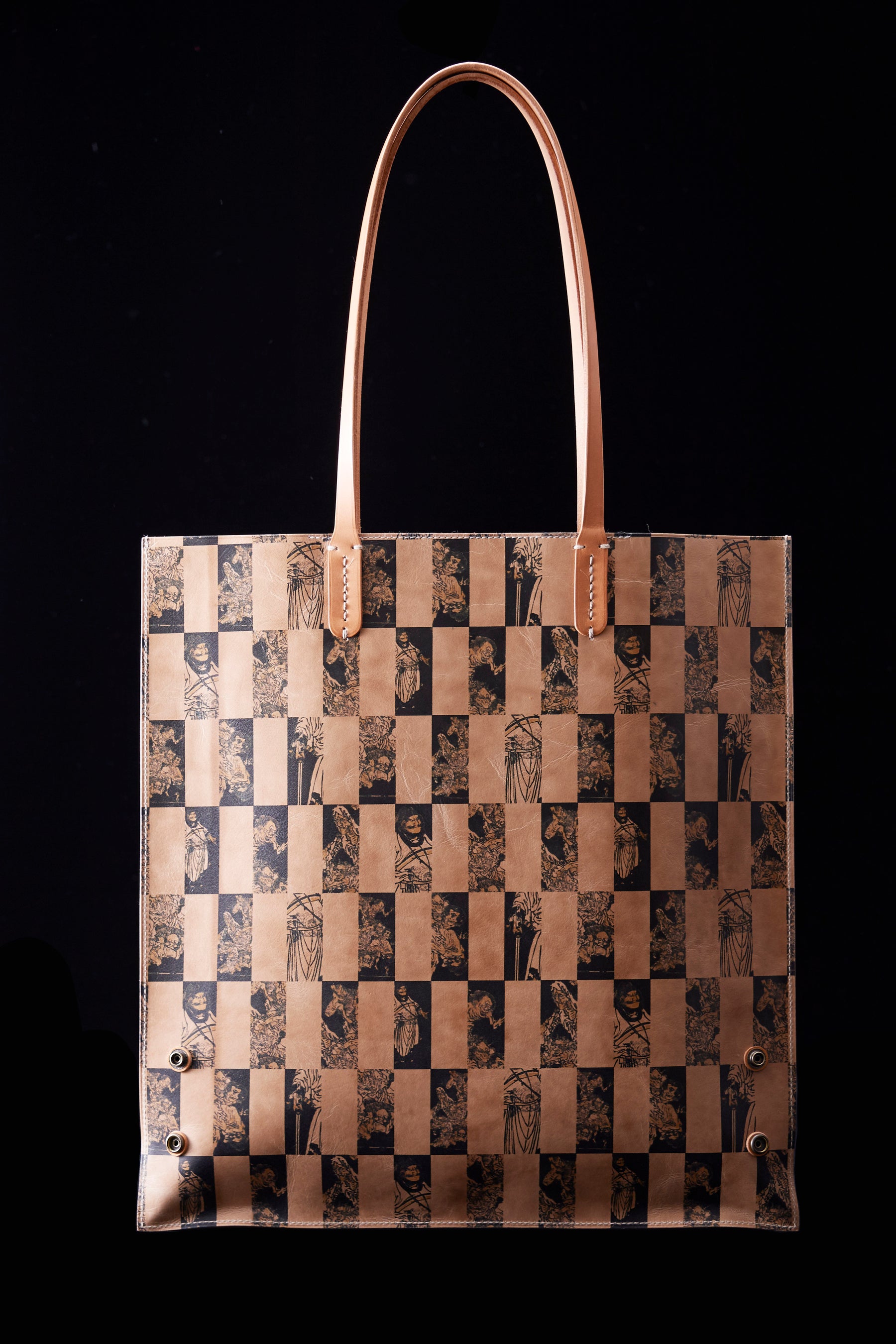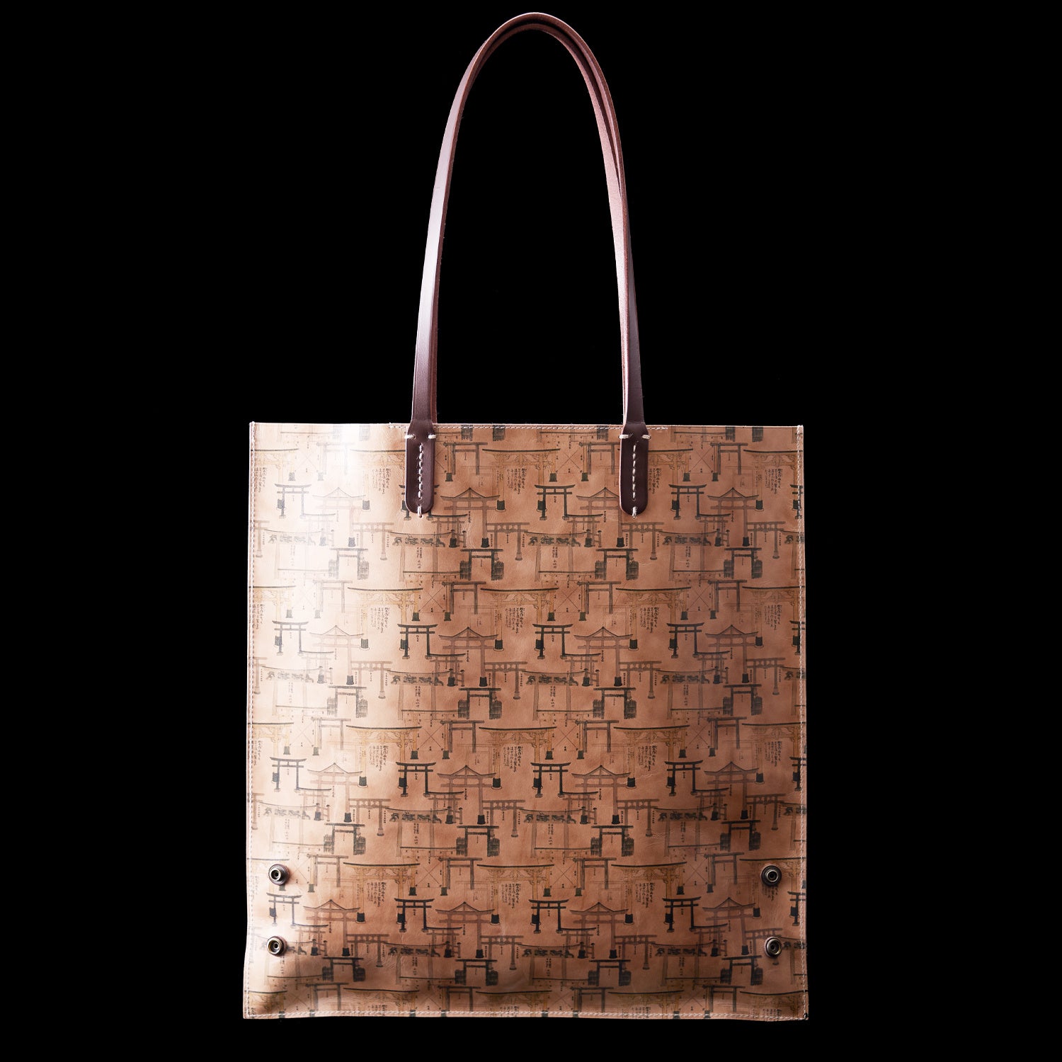 日本を代表する浮世絵師葛飾北斎が「北斎漫画」第五編で描いた様々な鳥居、第三編で描いた鐘馗と邪鬼をモチーフにしたトートバッグです。ナチュラルレザーに施した高精細なインクジェットプリントが魅力で、美しい一枚革仕立てのシャープなデザインに仕上げました。使うほどに革は艶としなやかさを増していきます。創悦のラインナップは、男女兼用のジェンダースタイルです。