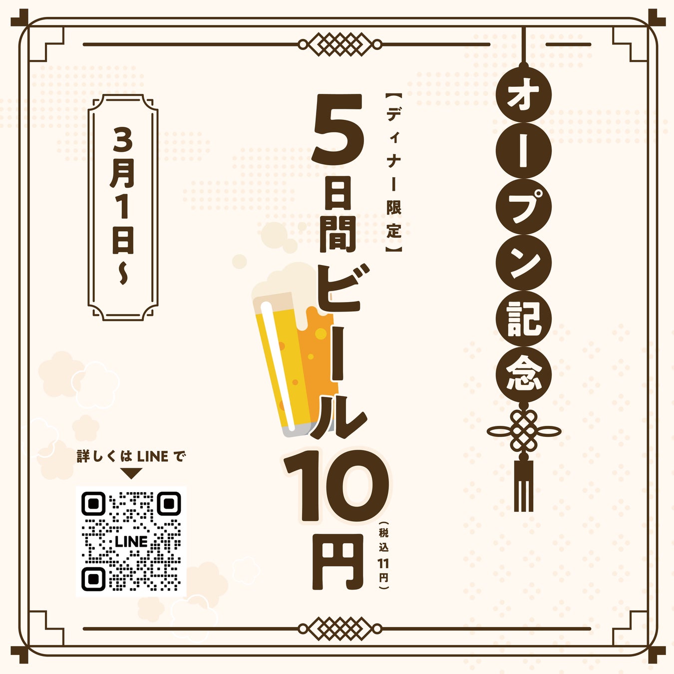 5日間限定オープニング記念:初来店のお客様に生ビールを特別価格10円(税込11円)で提供!