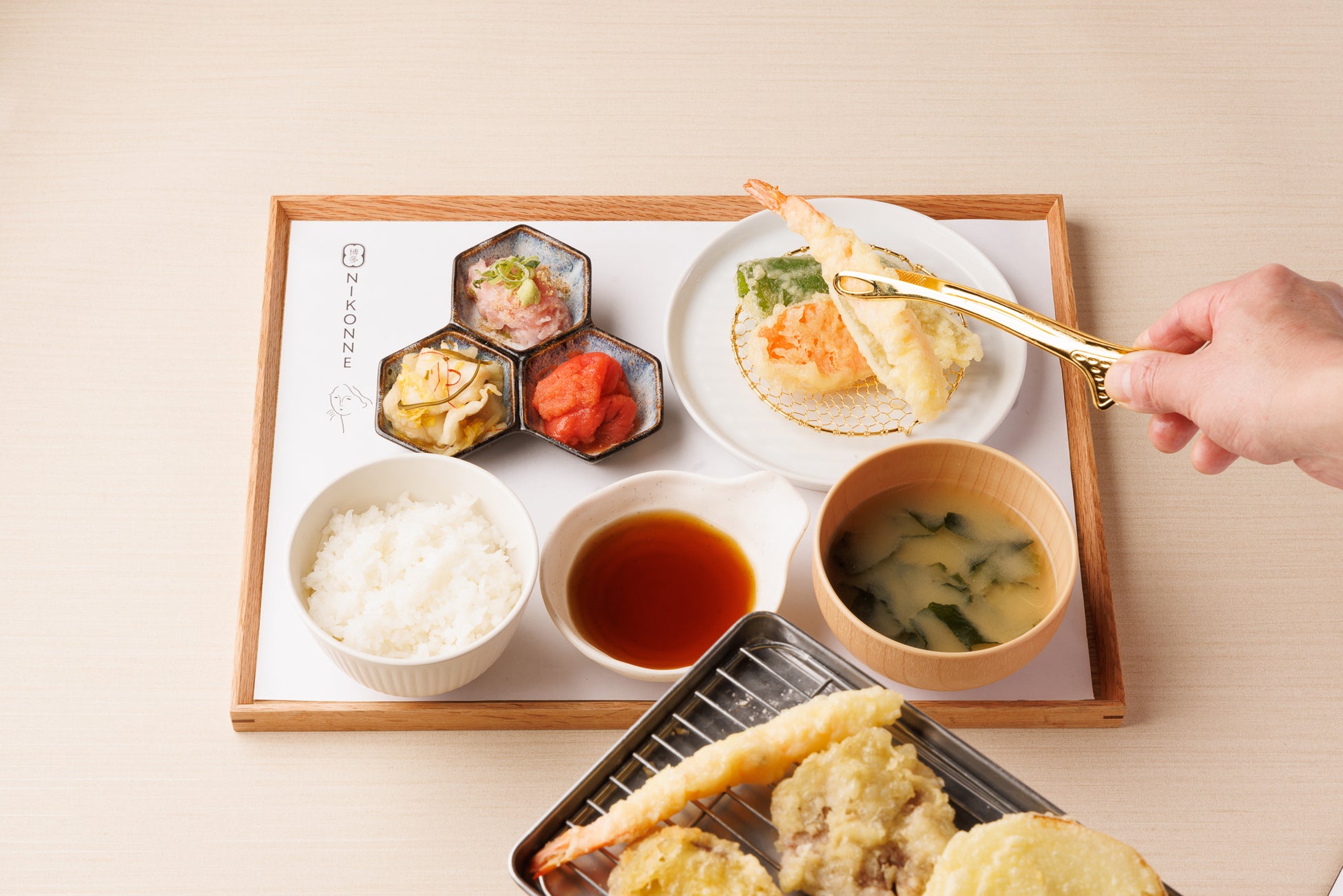 天ぷら: 博多NIKONNEの天ぷらは、博多では定番の豚ロースをはじめ、季節の野菜、魚介など、多彩な素材の天ぷらをお楽しみいただけます。