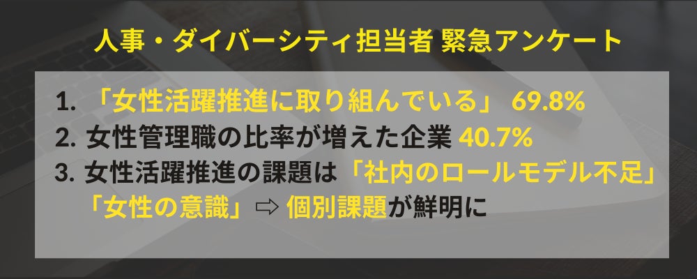 アンケートでは、「ロールモデル不足」、「女性の意識」「管理職の意識」が課題のトップ3となっていますが、女性活躍を進める上では、