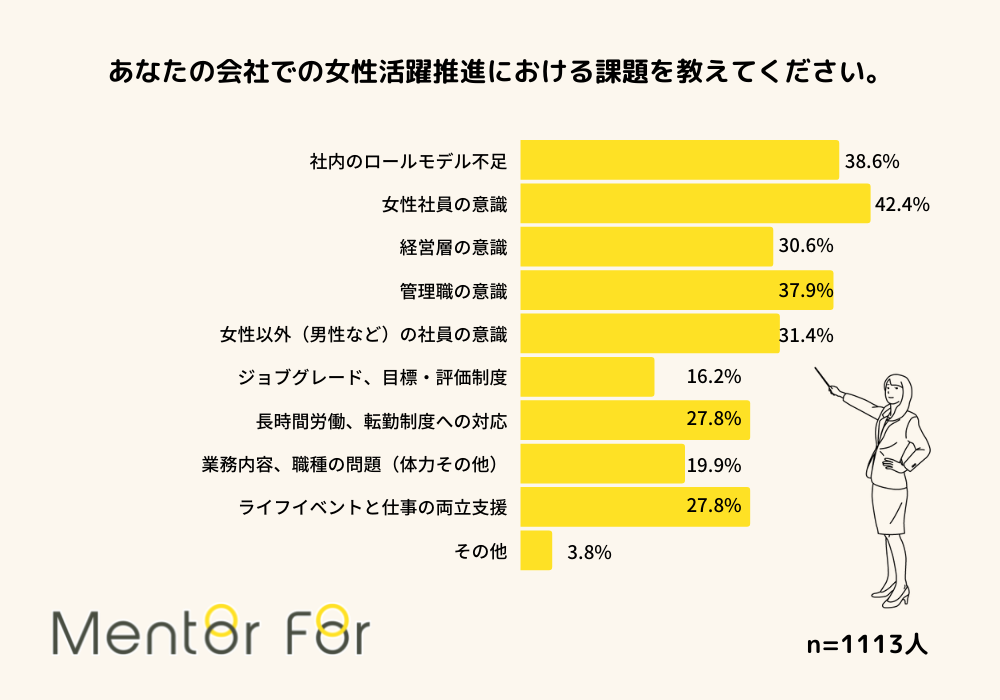 企業のD&I(Diversity & Inclusion)推進を目的とした、社外メンターの育成・マッチングを行う株式会社Mentor For(東京都渋谷区・代表取締役:池原真佐子)は、企業の女性管理職育成における直近の各社の状況・課題について企業の人事・ダイバーシティ担当者約1000人を対象とした緊急アンケート調査を実施いたしました。その結果、女性活躍推進の課題として半数近くの人事担当者が「社内のロールモデル不足」「女性の意識」と回答しており、女性管理職育成が社会的に浸透しつつある中で面の施策から個々人の点施策への転換が喫緊の課題であることが明らかになりました。