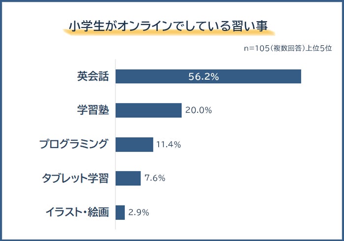小学生のお子さんにオンラインの習い事をさせている親御さん105人に、どんな習い事をしているか聞いたところ、「英会話」が圧倒的多数で全体の半数以上を占めました。