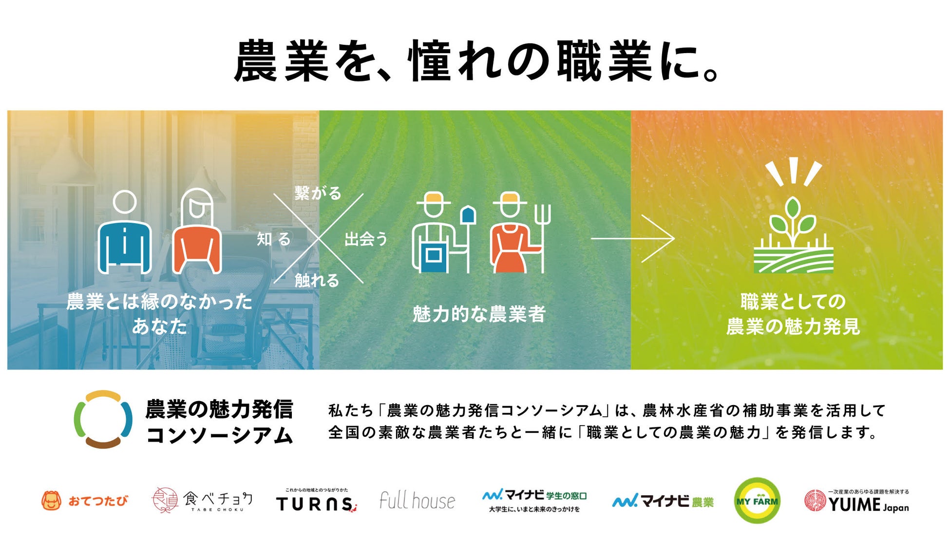 これまで農業に縁のなかった方々が、新たに「職業としての農業の魅力」を発見してもらう機会をつくるため、農林水産省の補助事業「農業の魅力発信事業」を活用して、農業と生活者の接点となる企業等、民間企業7社による「農業の魅力発信コンソーシアム」が設立されました。