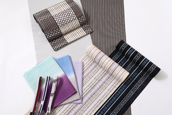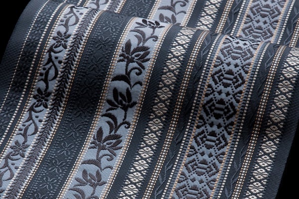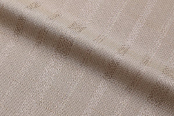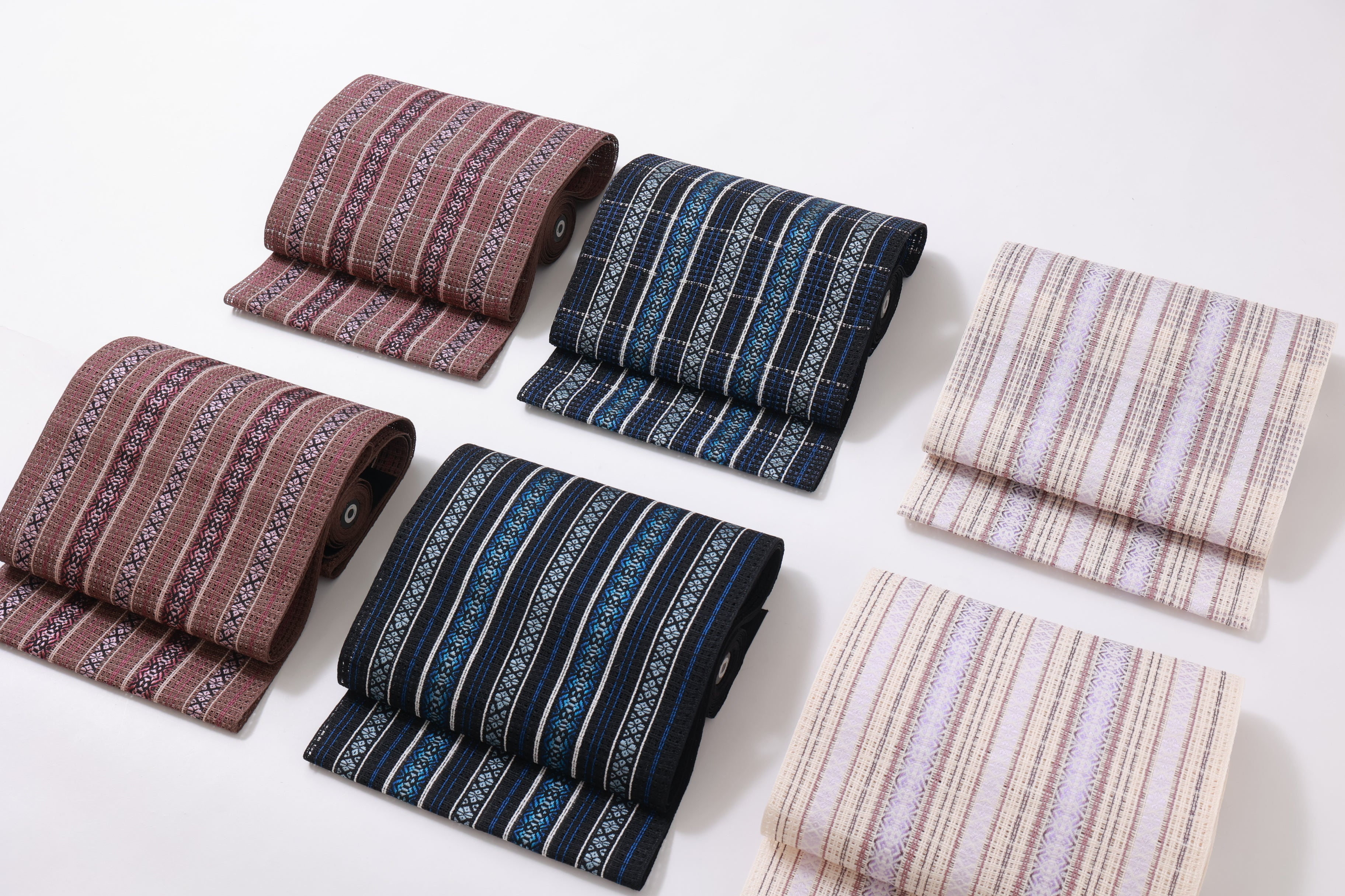 夏の織物は羅・絽・紗という織り方があります。博多織では一般的に紗で織られた帯がほとんどですが、「絽紙布献上」は、絽の組織に緯糸に紙布(しふ)を織り込んだ独特の風合いが特長の帯です。単衣から夏の時期に、夏のきものから浴衣まで締められるアイテムとなっています。