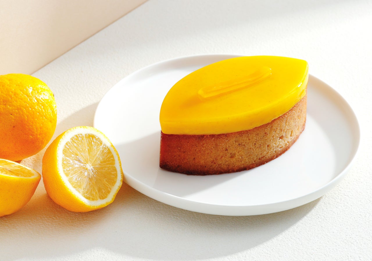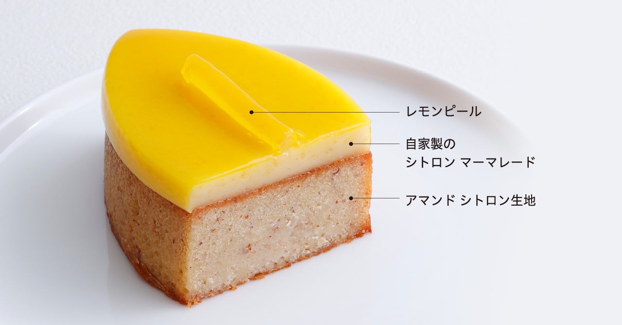 土台のアマンド シトロン生地はシトロンとアーモンドを合わせた生地を焼きあげた後、レモン果汁と隠し味にライムを含んだシロップをしっかりと染み込ませ、しっとりとした生地に仕上げています。