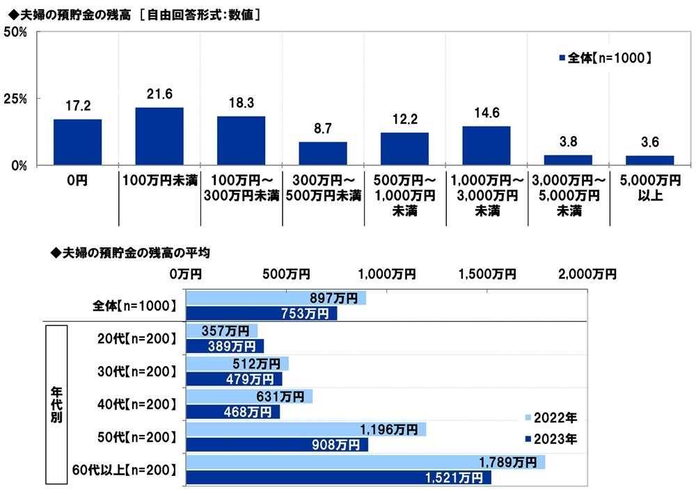 夫婦の預貯金の残高を聞いたところ、「100万円未満」(21.6%)や「100万円~300万円未満」(18.3%)、「1,000万円~3,000万円未満」(14.6%)などに回答が分かれ、平均は753万円でした。