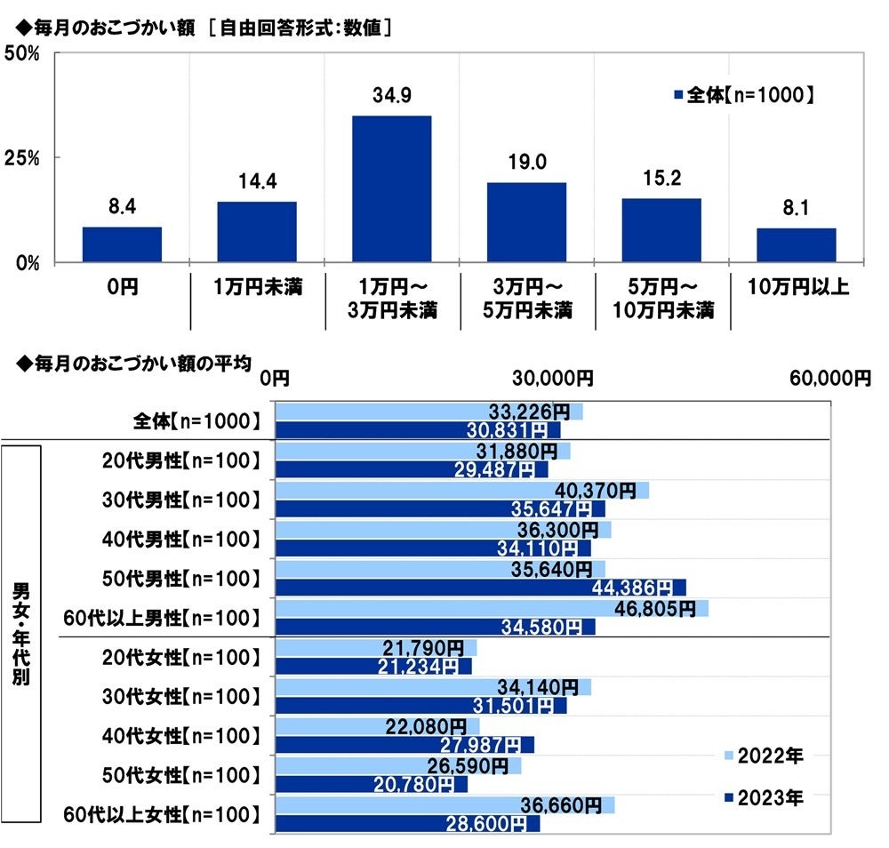 毎月のおこづかい額(=ひと月に自由に使えるお金)はどのくらいか聞いたところ、「1万円~3万円未満」(34.9%)に多くの回答が集まり、平均は30,831円となりました。
