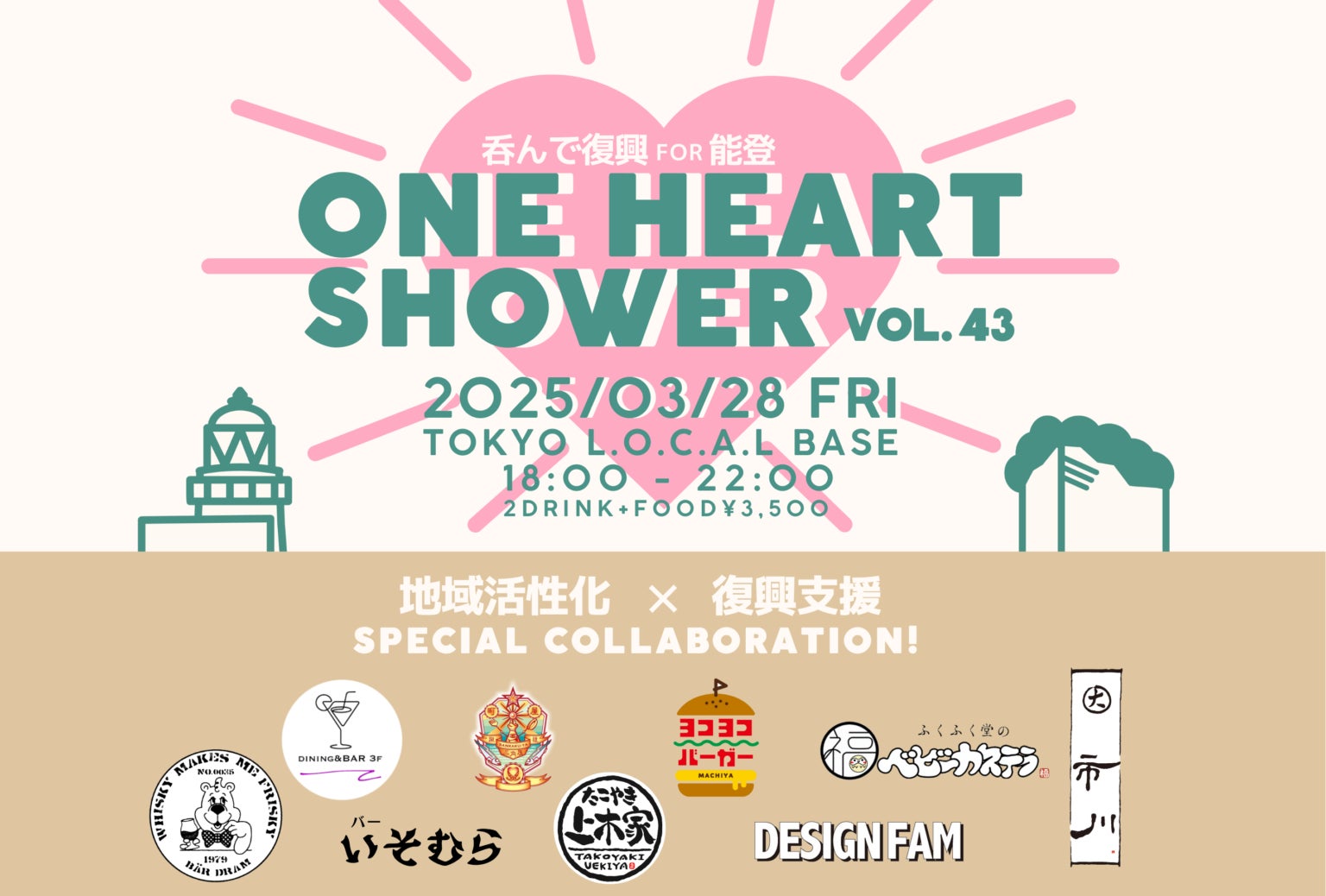 被災地の「復興支援」と東京都荒川区の「地域活性化」を活動の目的とするNPO法人TOKYO L.O.C.A.L (東京都荒川区/代表理事:丸山慎二郎)は、被災地に直接行けない方々にも災害支援を身近に感じていただくため、復興支援イベント『ONE HEART SHOWER vol.43 for能登』を3月28日(金)18時より開催いたします。“飲んで復興”をコンセプトに、通算43回目となる今回は、荒川区にある人気飲食店や、トータルビューティーサロン、アパレルブランド等10店舗による合同開催が実現。東京で能登半島への応援に取り組みます。