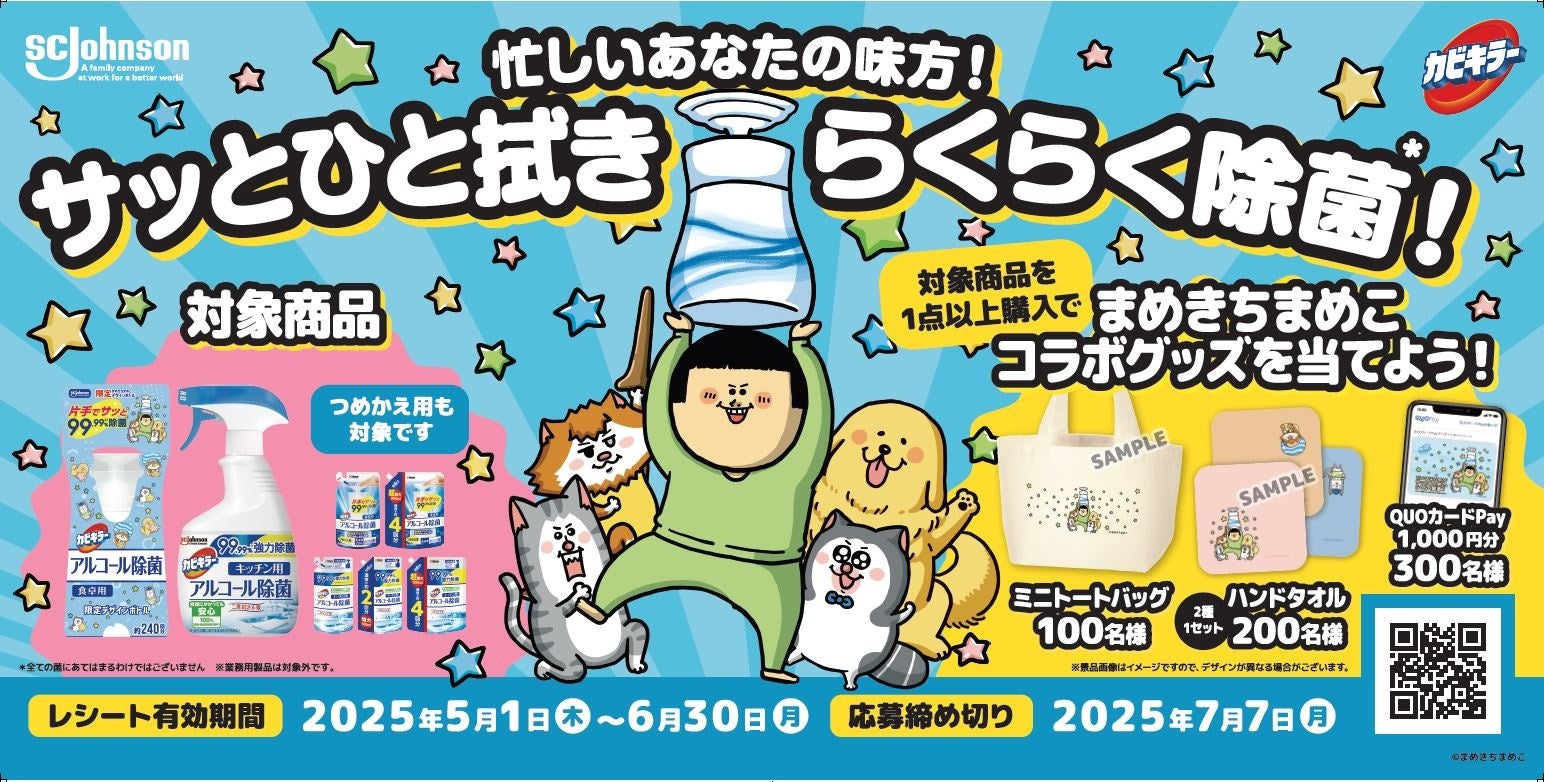 月間7,000万PVを記録した大人気ブロガーまめきちまめことカビキラーアルコール除菌のコラボキャンペーンを2025年5月1日より開始します。キャンぺーン期間中に、対象のカビキラーアルコール除菌の商品1点以上ご購入のレシートがあれば応募可能で、まめきちまめこスペシャルコラボの描き下ろしグッズが抽選で合計600名様に当たります!