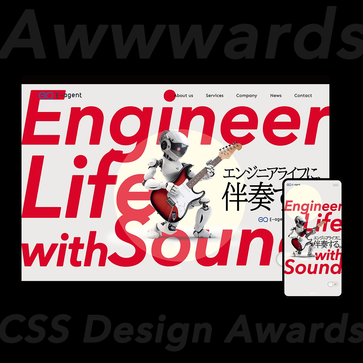 大橋代表がギタリストとして活動されていたことや、サイトにテーマソングが流れる演出などもヒントにしながら、音楽的な世界観を表現。ロックなテンションの中に、キービジュアルのロボットに少しとぼけた表情を加えることで、E-agent様らしい遊び心を込めました。
