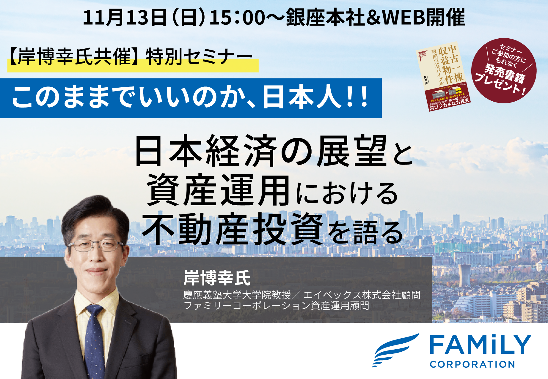 本セミナーでは、「現在」と「これから」の日本経済のマクロな視点から考える適切な資産運用・不動産投資について講演形式で岸博幸氏にお話しいただきます。