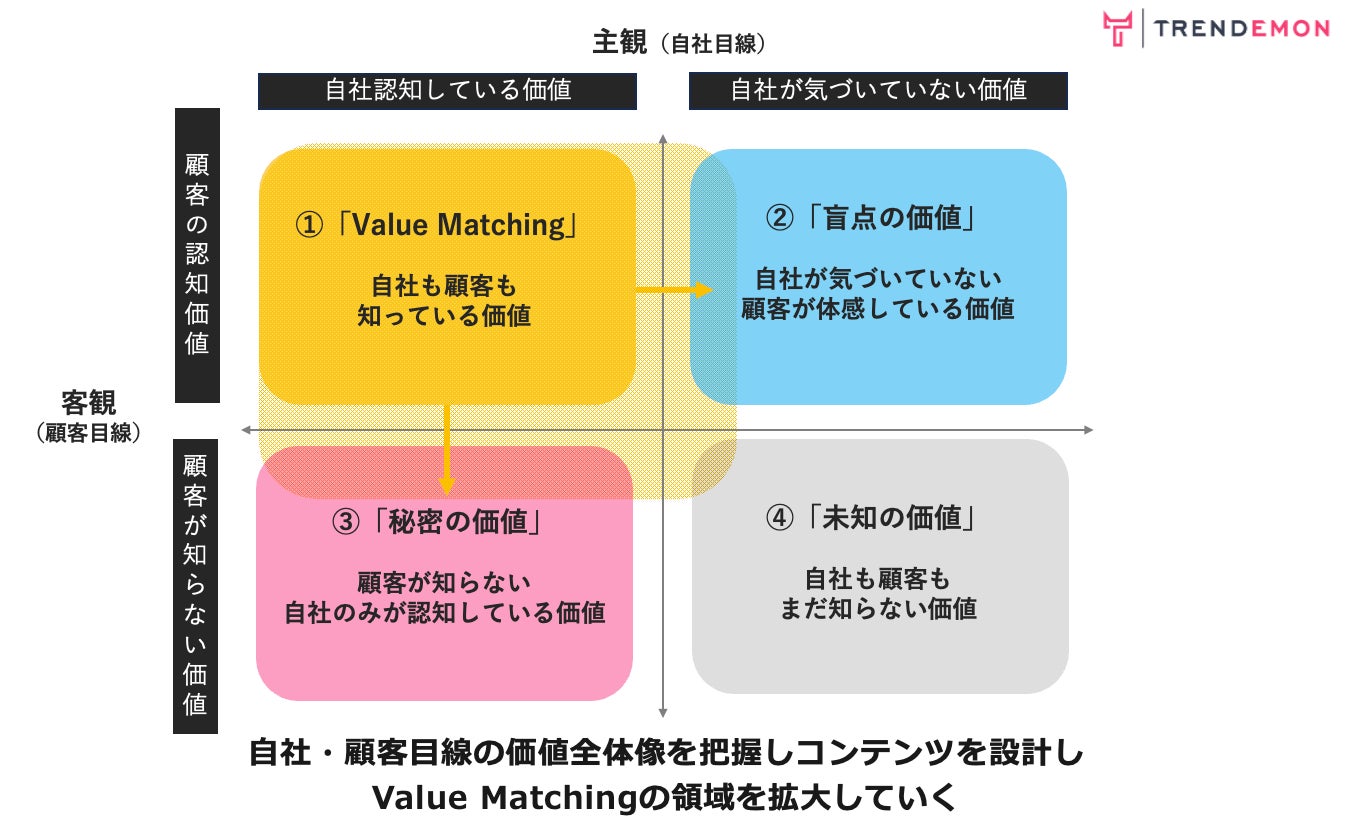 本スキームでは事前にヒアリングを行い、自社目線での押し出したい価値と顧客が感じている顧客目線での価値を明らかにしていきます。その方法として現状の自社のバリューを整理するための上図の概念図を用いて説明すると、左上の①は自社と顧客も共に認識している「価値」=Value Matchingしている理想の状態となります。 しかし、多くの企業では①を自社が訴求したいものと混同してしまうケースが多くあり、ターゲットとなる顧客に刺さらないコンテンツを量産してしまうことがあります。