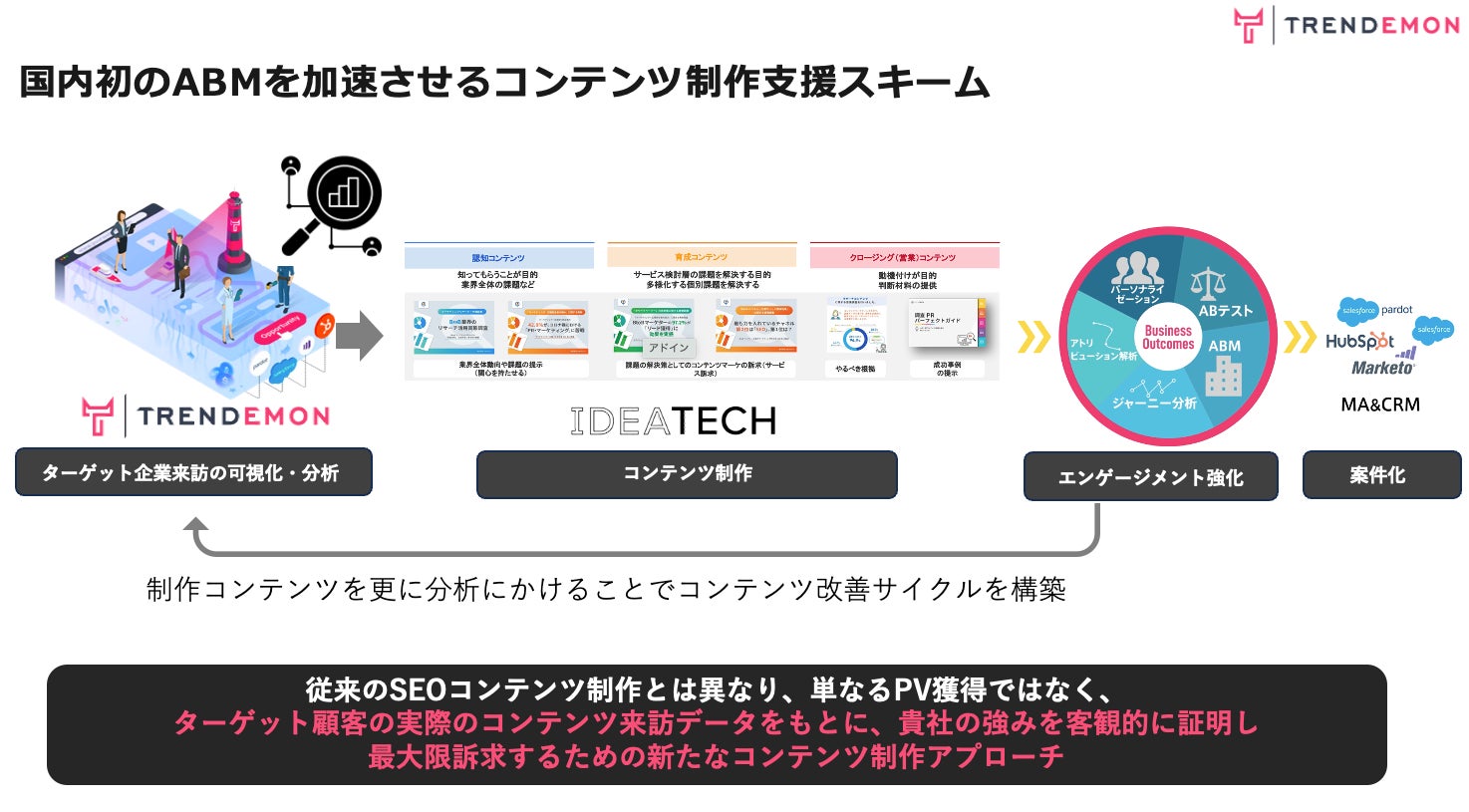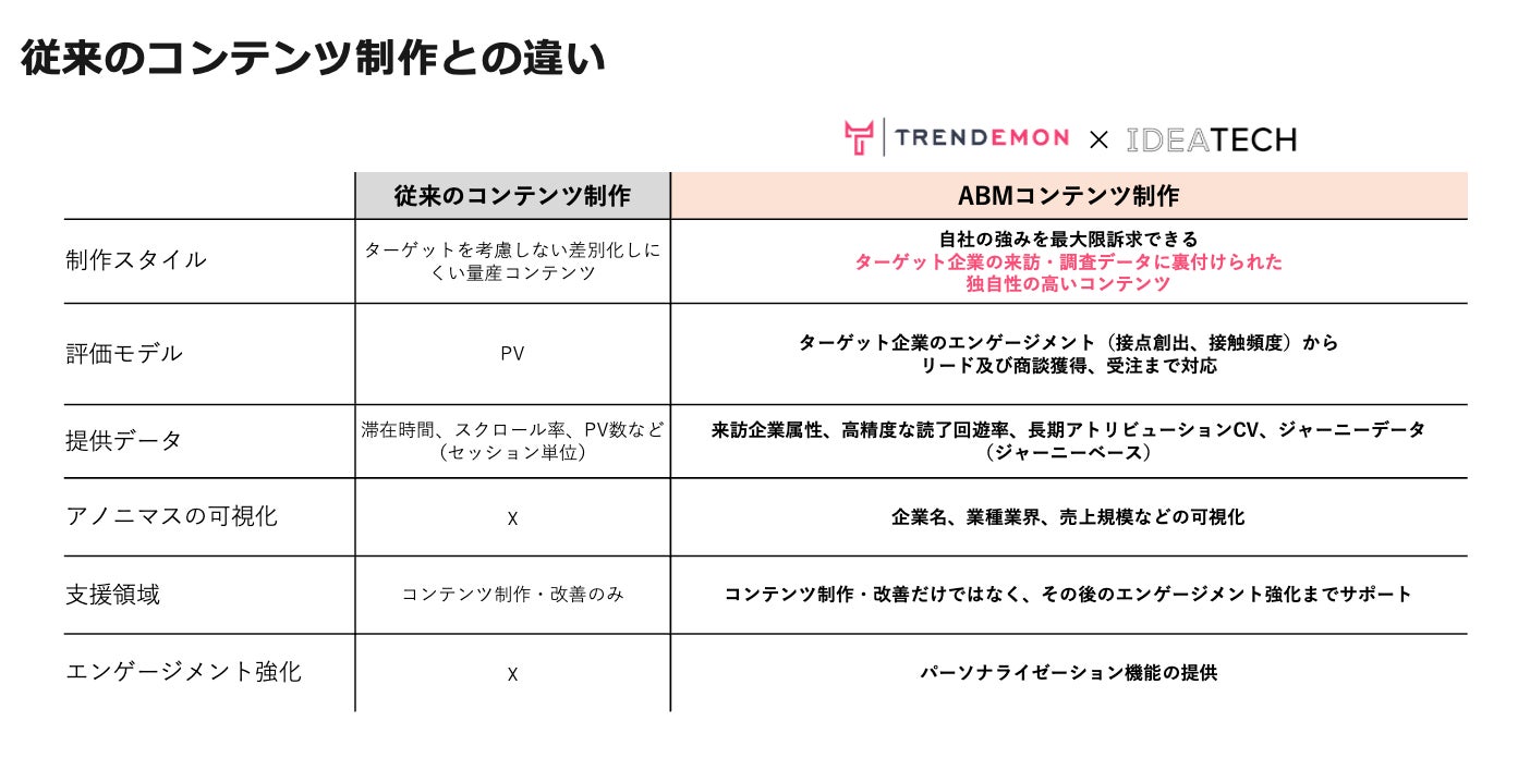 TRENDEMONは、BtoB企業に特化した国内初*となる購買インテント情報をもとにした『コンテンツ制作支援サービス』を圧倒的な実績を持つ株式会社IDEATECHと共に提供開始致しました。