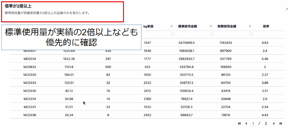 「標準使用量が実績の2倍以上」といった大きなズレも簡単に特定。
