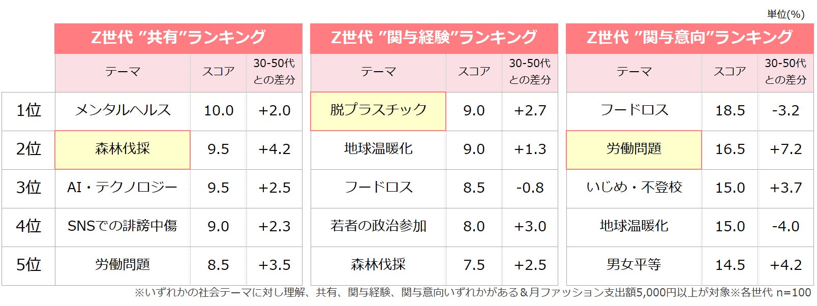 続いて、一定以上のファッション関心層を対象に、関与している社会問題の内訳を詳しく見ると<data1-2>、Z世代においては「森林伐採」、「脱プラスチック」、「労働問題」などがスコアの絶対値・上世代との差分どちらにおいても高くなっています。