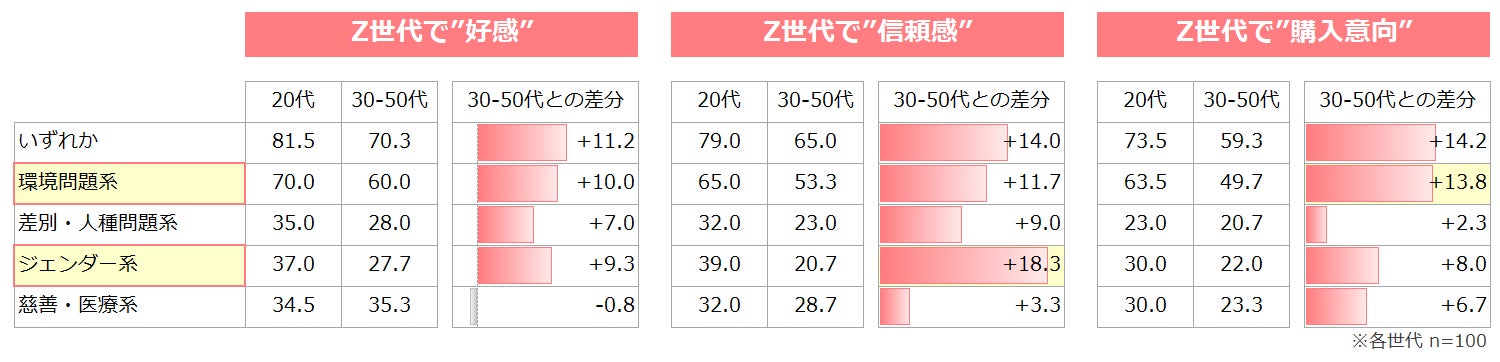 その結果、Z世代は上世代に比べていずれのテーマでもポジティブな反応を示す傾向があり、特に「ジェンダー系テーマ」に対しては信頼感が+18.3pt、「環境問題系テーマ」に対しては購入意向が+13.8ptと大きな差が見られました。