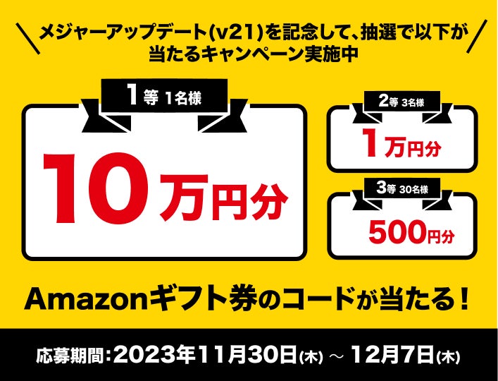 TechFeed v21へのメジャーアップデートを祝し、当社では最大10万円分のAmazonギフト券コードが当たる以下のキャンペーンを開催いたします。