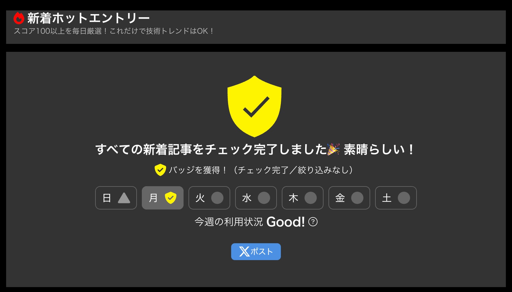 ゲージが溜まりきって記事チェックを完了すると、バッジを獲得することができます。これにより、エンジニアの皆様の技術情報収集に対するモチベーションを更に高めることを狙っています。