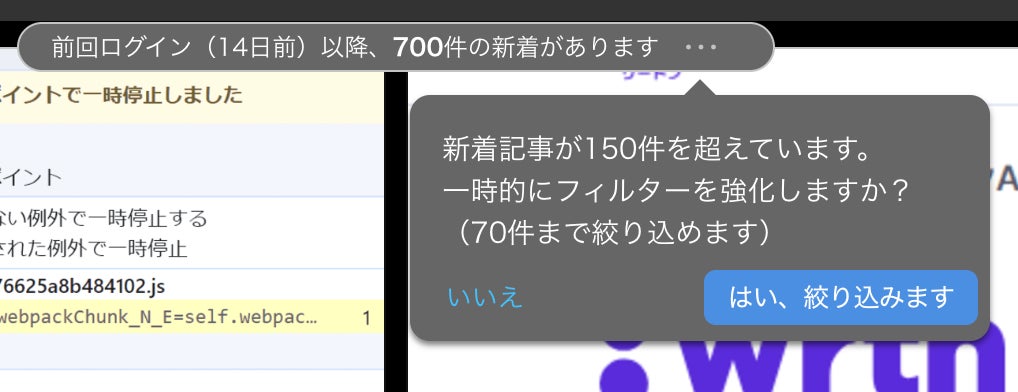 ここで新着記事数が多すぎると判断した場合、TechFeedは自動的に絞り込みを促すダイアログを表示します。