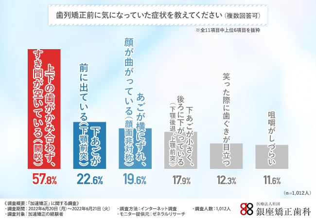 「歯列矯正前に気になっていた症状を教えてください(複数回答可)」と質問したところ、『上下の歯がかみ合わず、すき間が空いている(開咬)(57.8%)』と回答した方が最も多く、次いで『下あごが前に出ている(下顎前突)(22.6%)』『あごが横にずれ、顔が曲がっている(顔面非対称)(19.6%)』と続きました。