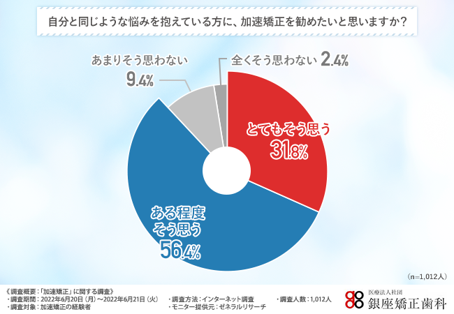 そこで、「自分と同じような悩みを抱えている方に、加速矯正を勧めたいと思いますか?」と質問したところ、8割以上の方が『とてもそう思う(31.8%)』『ある程度そう思う(56.4%)』と回答しました。