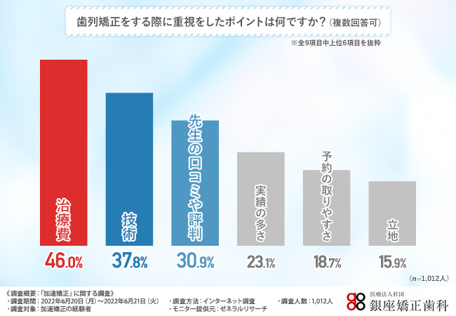 そこで、「歯列矯正をする際に重視をしたポイントは何ですか?(複数回答可)」と質問したところ、『治療費(46.0%)』と回答した方が最も多く、次いで『技術(37.8%)』『先生の口コミや評判(30.9%)』と続きました。