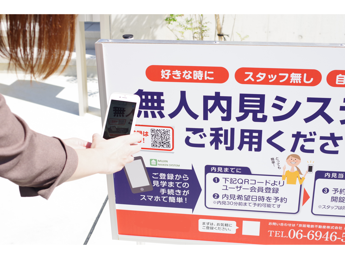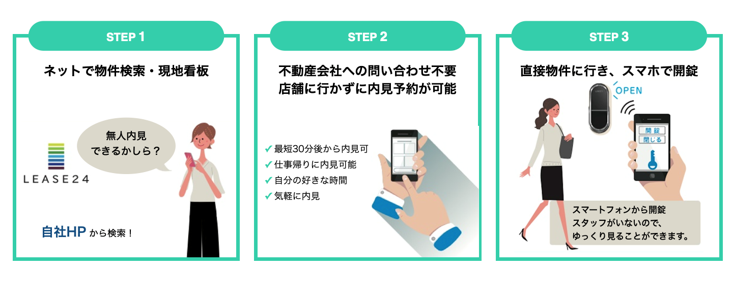 WEB上で、ご希望の物件、ご希望の時間に「内見」の予約を入れます。予約した日時に直接現地を訪問、スマートフォンに表示される開錠ボタンをタップし、物件ドアのスマートロックを開錠するといった非対面で内見できるシステム。