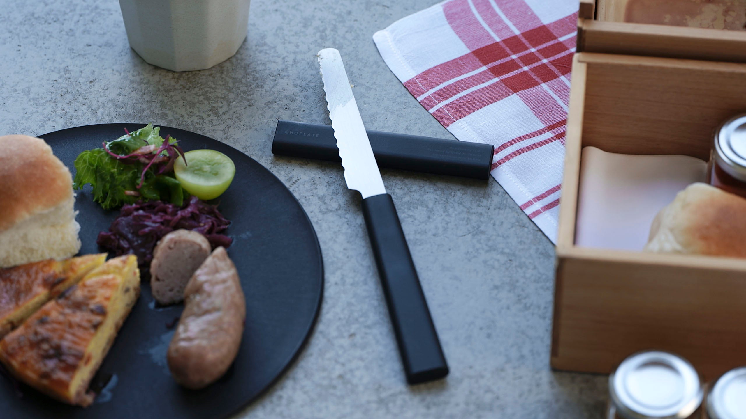 累計販売数 約6万枚!大好評の、まな板になるお皿『CHOPLATE』と、新潟・燕三条の包丁メーカー藤次郎がコラボレーション。CHOPLATEと一緒に使いやすい、サヤ付きの『ミニナイフ』が完成しました。