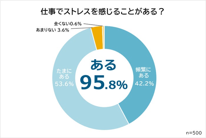 仕事をしている10~60代の男女500人に「仕事でストレスを感じることがあるか」質問したところ、「頻繁にある(42.2%)」「たまにある(53.6%)」が合わせて95.8%という結果に。