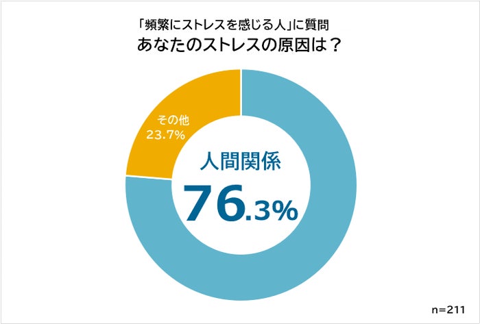 また、「頻繁にストレスを感じる」と回答した人のうち76.3%(211人中161人)は、人間関係に起因するストレスを感じていることがわかりました。
