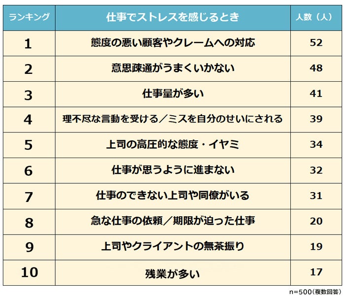 どんなときにストレスを感じるか聞いたところ、「態度の悪い顧客やクレームへの対応(52人)」が最も多く、次いで「意思疎通がうまくいかない(48人)」がランクインしました。