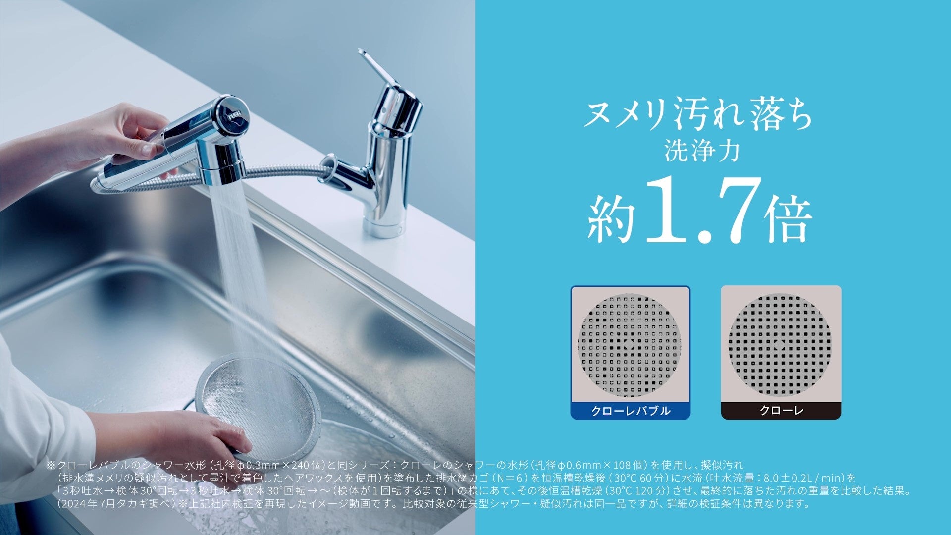 ※1:バブル数量はクローレバブルのシャワー水形で通水する前の原水と、通水して吐水された水の各々で測定した水流1mlあたりのバブル数量の差を算出した結果。数値は超純水(水温:25°C±1°C・吐水流量8.0L/min)を使用、測定器:NanoSight NS300(FBIA指定試験機関)を用いた測定(2024年 7月2日、計10回)による平均値[数量:平均約879万個/ml][バブルサイズ:平均径約0.1164μm、最頻径約99.4nm]◎水質・環境・時期により数値は変動します。