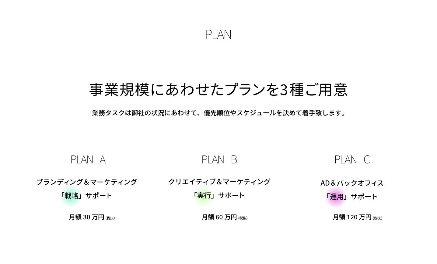 内容:PLAN AとBの内容に加え、デジタル広告のプランニング・配信・レポート、その他にバックオフィスの売上や人事評価システムの構築や整備を行います。