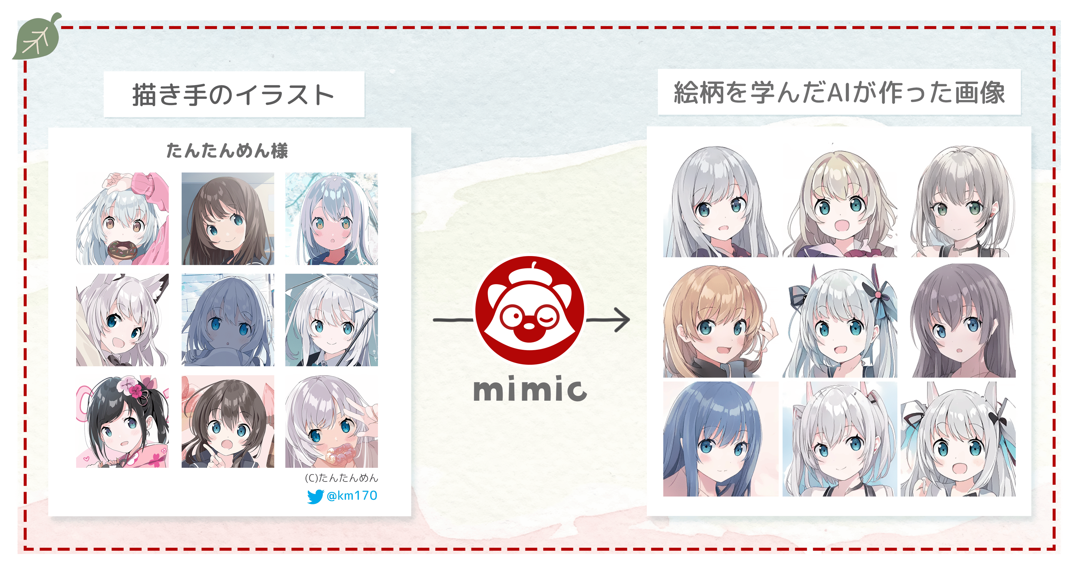 通常のイラスト生成AIは多量のイラストを学習して様々なテイストのイラストを生成するものですが、mimicで使用するAIは「少ない枚数から特定の書き手の個性を捉えること」に特化しています。
