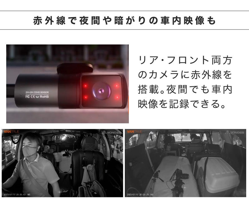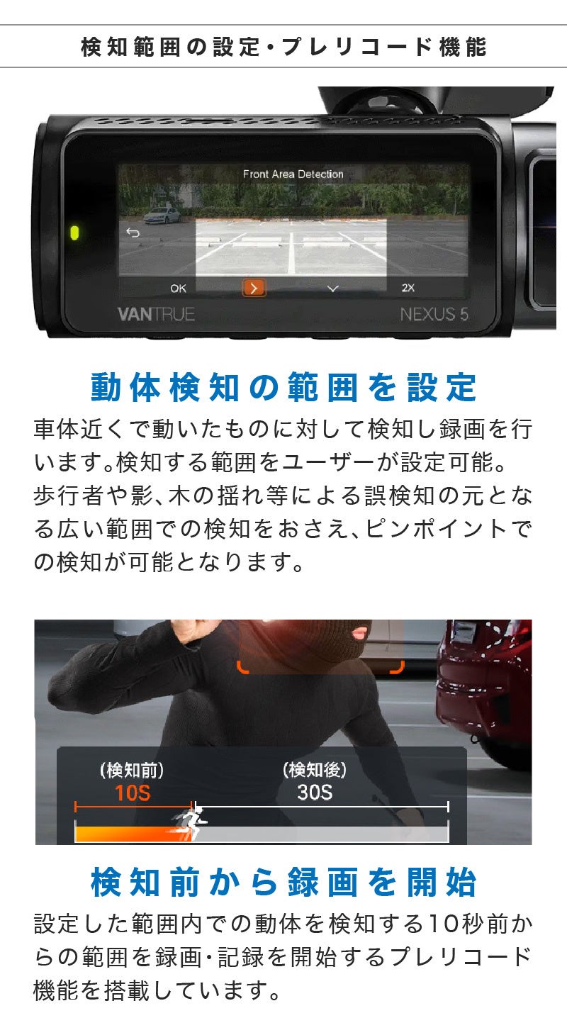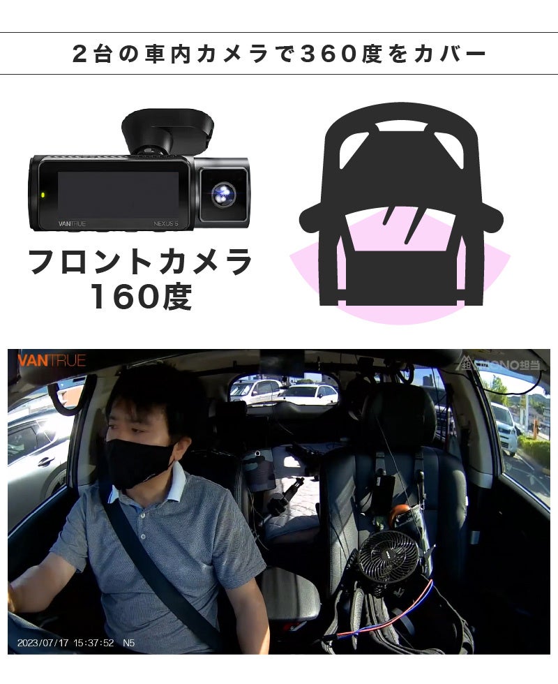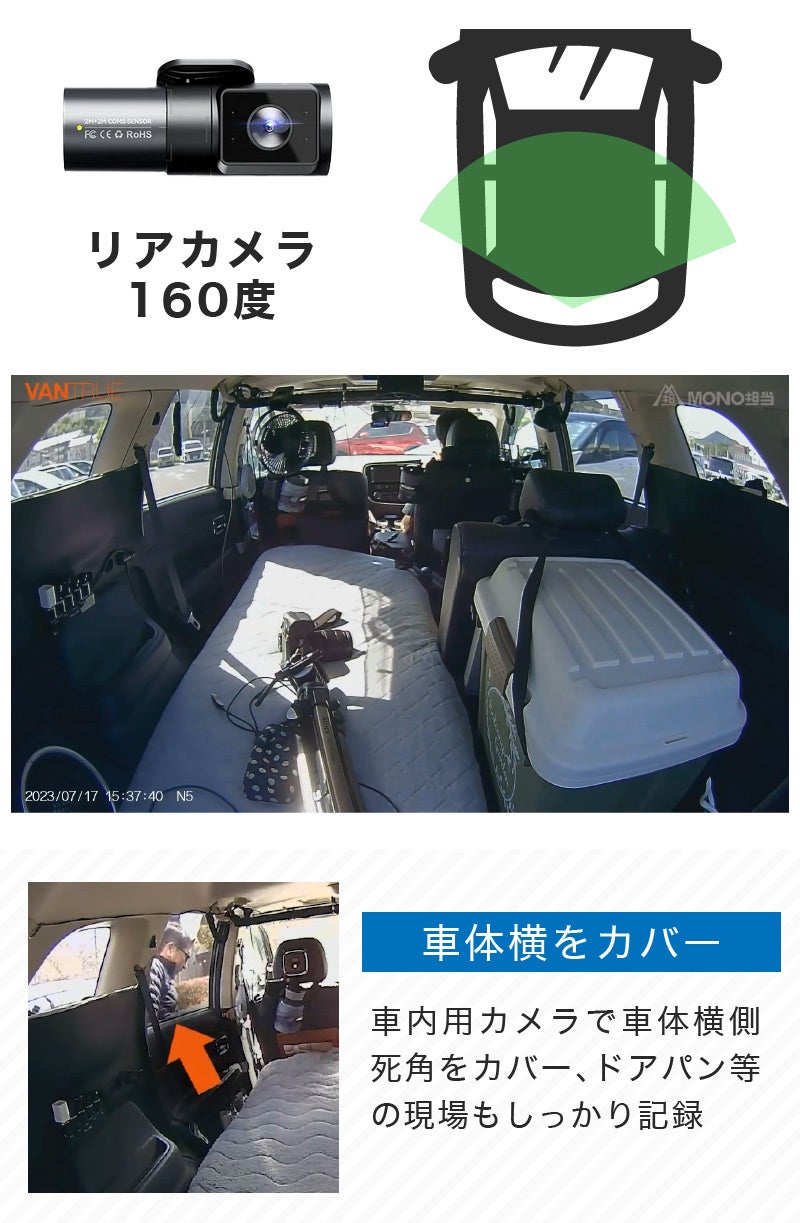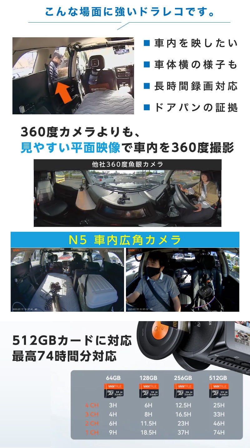 VANTRUE N5は、前方、後方、車内後方(窓ガラス越しに後部座席両側面)、車内前方(窓ガラス越しに運転席・助手席側側面)をカバーする4つのカメラを搭載した全方位録画の次世代ドライブレコーダーです。