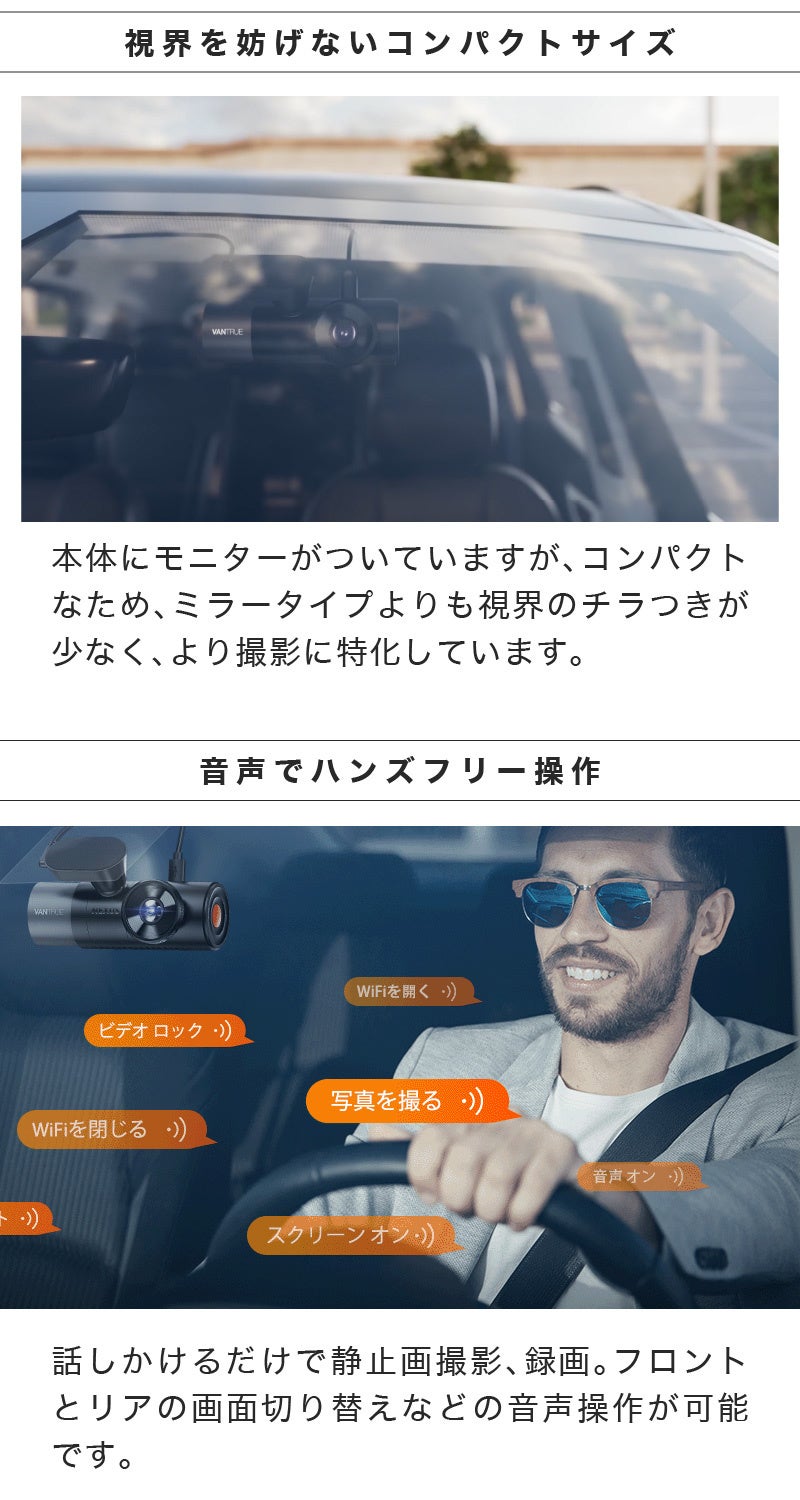 死角が少なく、より包括的な映像を記録できます。あおり運転や幅寄せ、ドアパンチなど、運転中のトラブルはもちろん、後部座席のお子様の様子やチャイルドシートの安全確認などにも活用できます。