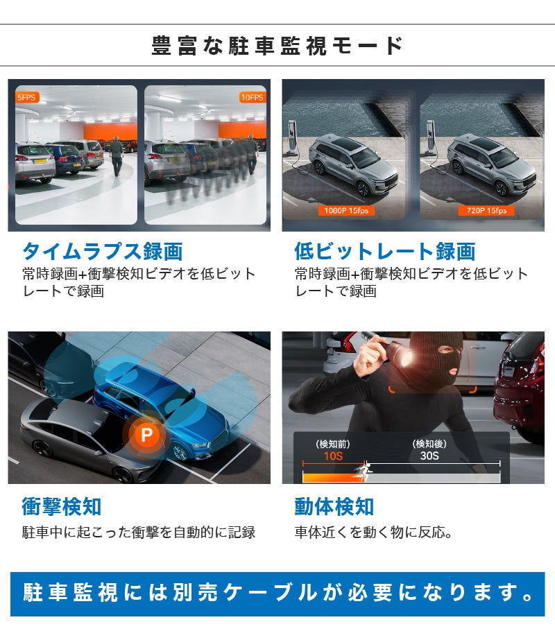 衝撃検知や動体検知により、駐車中のトラブルもしっかり記録します。(※別売りの直結電源ケーブルが必要です) タイムラプス録画機能を使用すれば、長時間の駐車監視でもSDカードの容量を節約しながら、周囲の状況を記録できます。