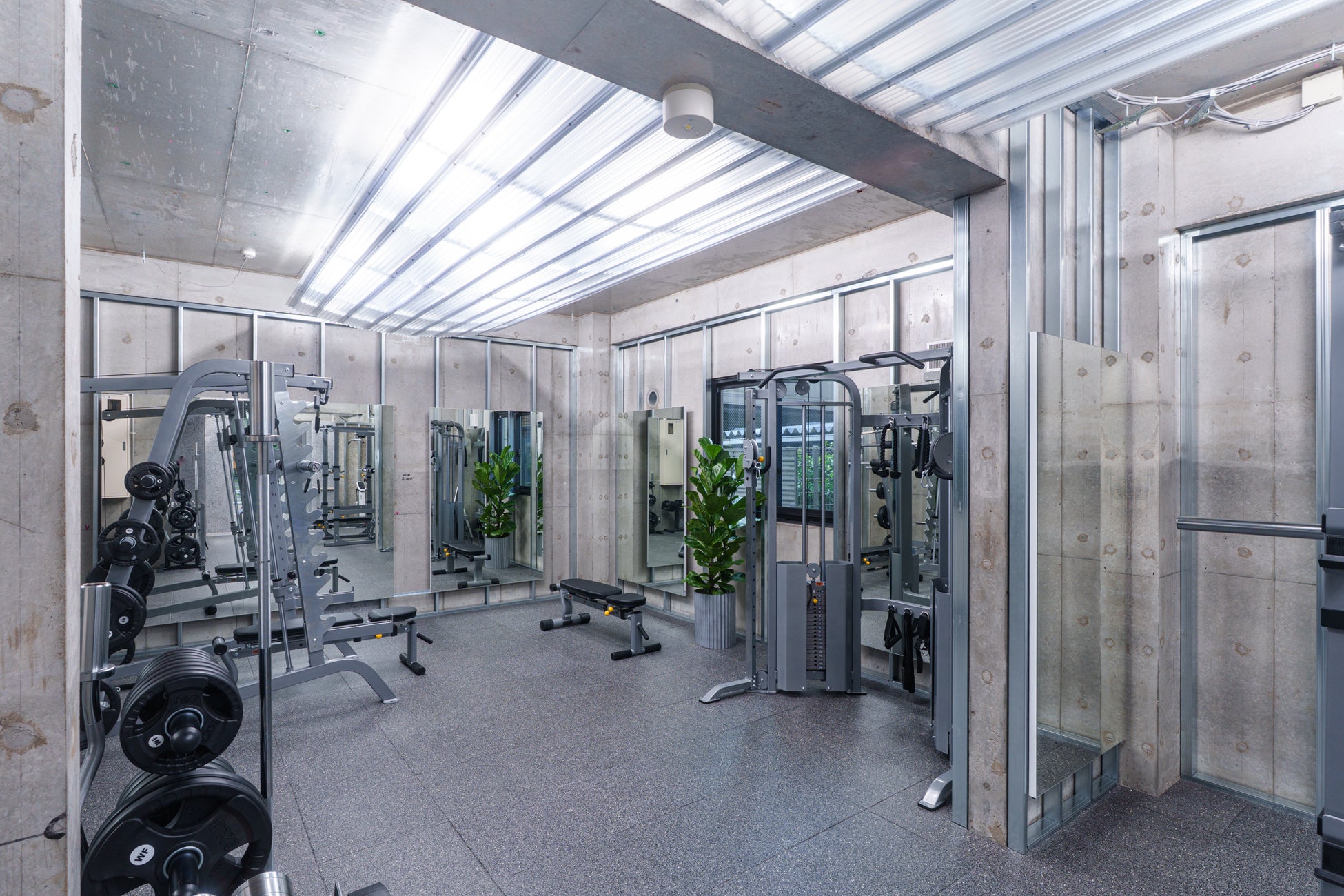 また、照明器具を覆うように設けられたポリカーボネート波板は、光を柔らかく拡散し、空間全体を均質に包み込むことで、閉塞感のない明るさと透明感を生み出しています。この天井構成は、限られた高さの中でも光の“広がり”を感じさせると同時に、ベンチプレスなど仰向けの姿勢で行うトレーニング時に照明の眩しさを軽減し、視界の快適性にも配慮しています。