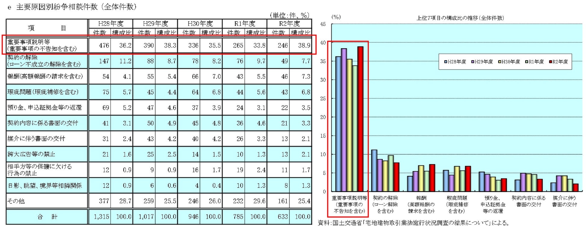 国土交通省の2022年のデータによれば、不動産物件調査に起因する紛争は年間600件以上に上り、相談件数全体の4割以上を占めています。特に不動産投資が増加する昨今、不動産物件調査の重要性が一段と高まっています。不動産物件調査は将来のトラブル回避や適切な判断を支援するために欠かせないプロセスです。(資料:国土交通省「宅地建物取引業法施行状況調査の結果について」)