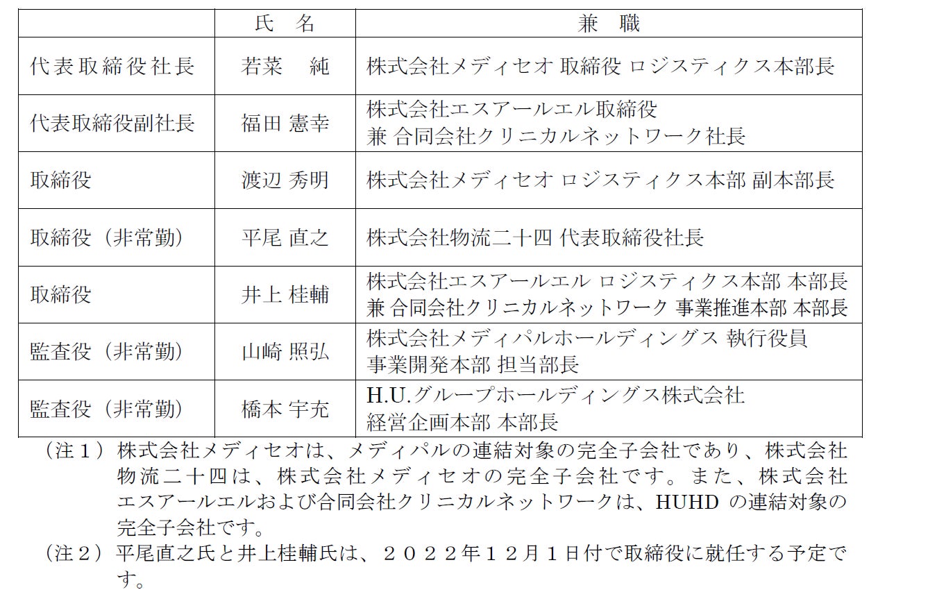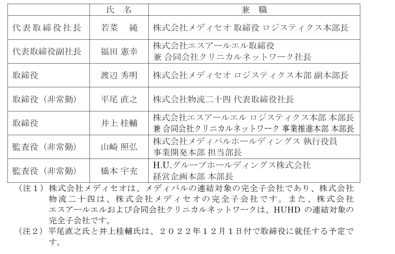 株式会社メディパルホールディングス(東京都中央区、代表取締役社長:渡辺 秀一以下、メディパルという)と、H.U.グループホールディングス株式会社(東京都新宿区、代表執行役社長:竹内 成和、以下、HUHDという)は、医療・ヘルスケア領域における物流合弁会社である株式会社メディスケット(埼玉県三郷市、代表取締役社長:若菜 純、以下、メディスケットという)の設立に関する合弁基本契約を2022年3月24日に締結※1し、その後協議を続けてまいりました。このたび、最終的な合意に至り合弁契約を締結いたしましたので、下記のとおりお知らせいたします。