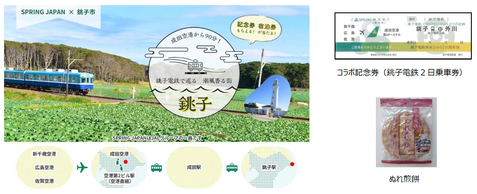 キャンペーン期間中、新千歳・広島・佐賀から成田へご搭乗のお客さまにコラボ記念券(銚子電鉄2日乗車券)と銚子電鉄 ぬれ煎餅をプレゼントいたします。