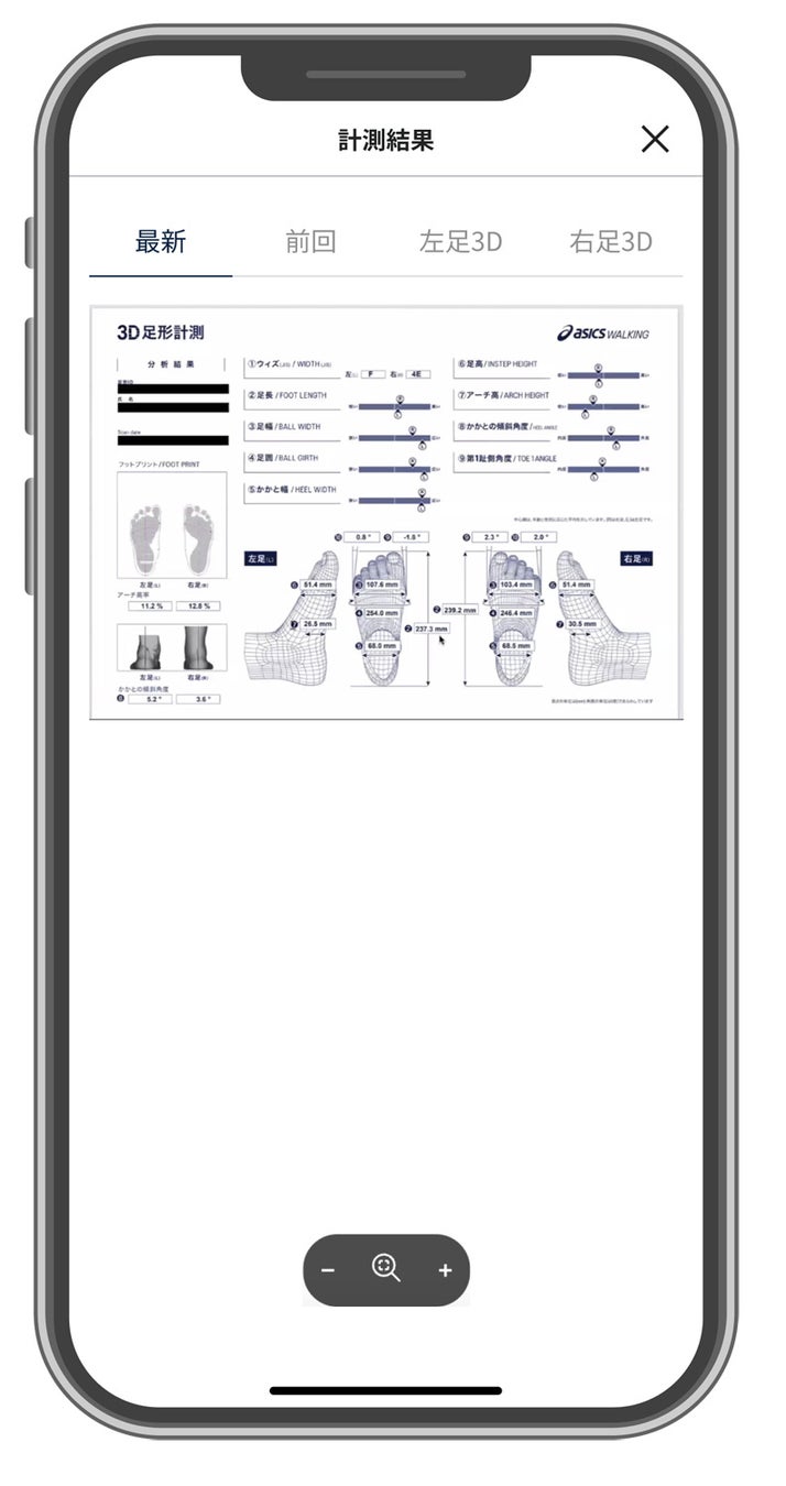 これまで、アシックスウォーキング直営店では計測した足形データを紙でお渡ししていましたが、「3D足形計測データ」閲覧機能の追加により、スマートフォン上でより手軽にアクセスできるようになりました。リアル店舗はもちろん、アシックスウォーキングオンラインストアでのお買い物時にも、靴選びの参考として活用できます。また、定期的に計測しながら足形データの変化を確認できるよう、過去2回分の計測結果を閲覧できるようにしています。さらに、数的な計測結果だけではなく、画面上に表示された3Dの足形画像を指でなぞりながら動かしていただくことで、足形を360度見ることもできます。