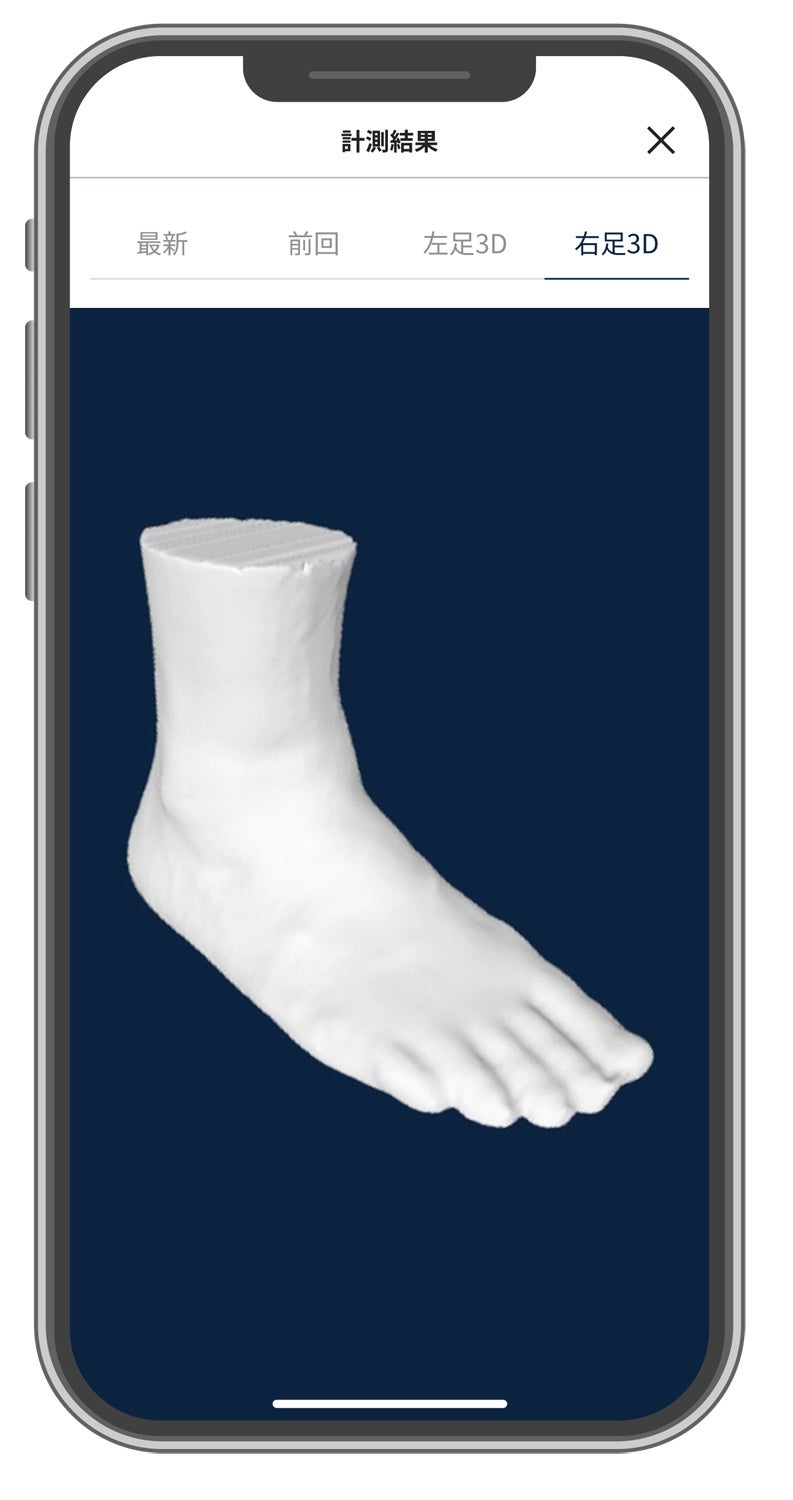 「3D足形計測データ」は、アプリ上で最大4種のデータが保存されるようになっており、「INFOOT 2」の計測結果2回分のほか、左右の3Dの足形画像を確認することができます。