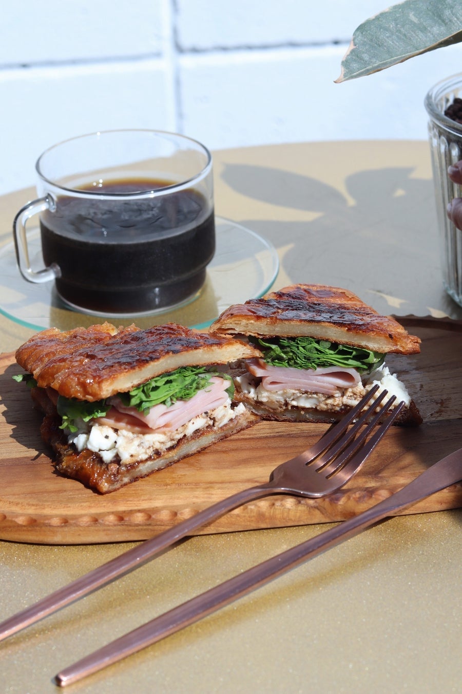 クロッシュとは、クロワッサンをプレスしはちみつでカリカリに焼き、2つのクロワッサンの間に具材を挟み込んだサンドウィッチ。