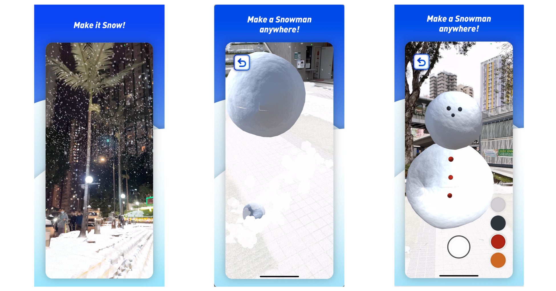 雪合戦以外にもAR上に雪を降らせたり、雪だるまをつくって遊べる機能もあります。スマホの画面でくるくると雪を集めて雪だるまを作成し、様々な場所でAR雪だるまを楽しむことができます!
