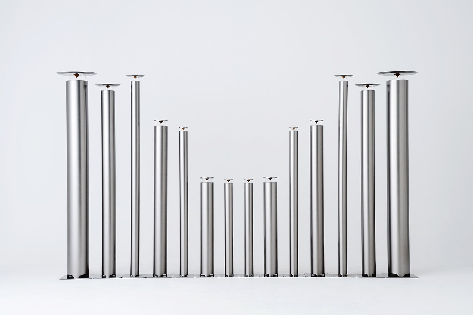 音質を求めた結果たどり着いた、柱状のフォルムが特徴。1つのスピーカーユニットで広い音域を出力し、頂点の反射板を使って周囲へと音を拡げていきます。音の調整を行わない、音源そのままを再生するスピーカーです。