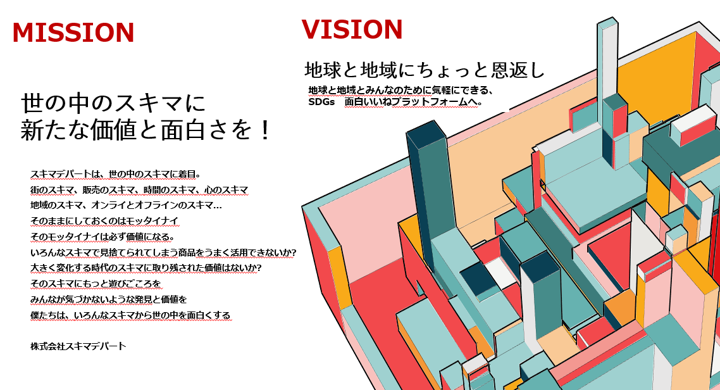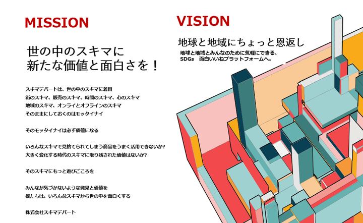 株式会社スキマデパートでは、都内を中心に不動産開発計画の中で一時的に未利用となるスペース(店舗や土地)を中心に借り上げ、その使われていない”スキマ”に新たな価値を創造して世の中に提供してきました。今後は、自由販売機®とパネルボードを合わせたブランド認知や、最新型の自由販売機®による商品サンプリングなどスキマデパートの強みである全国2,500台の飲料自販機を使った新たなプロモーションの形にチャレンジして「世の中のスキマに新たな価値と面白さ」を社会に提供していきます。