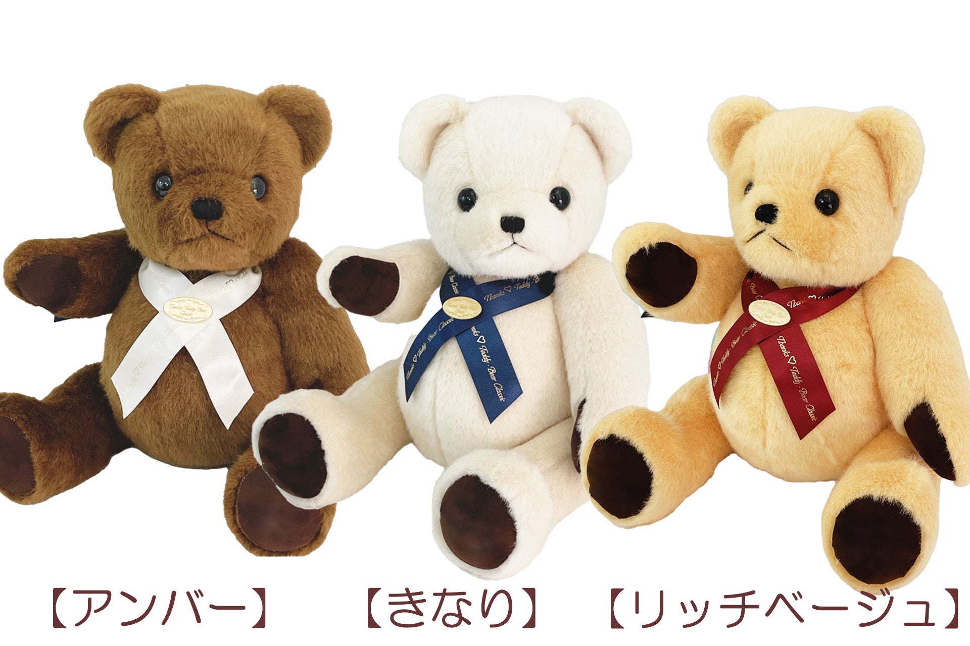 ボディカラーは、しっかりとしたお色の「アンバー」(茶)・おしとやかで上品な「きなり」(白)・くまさん工房一番人気の「リッチベージュ」(黄)の3色をご用意。