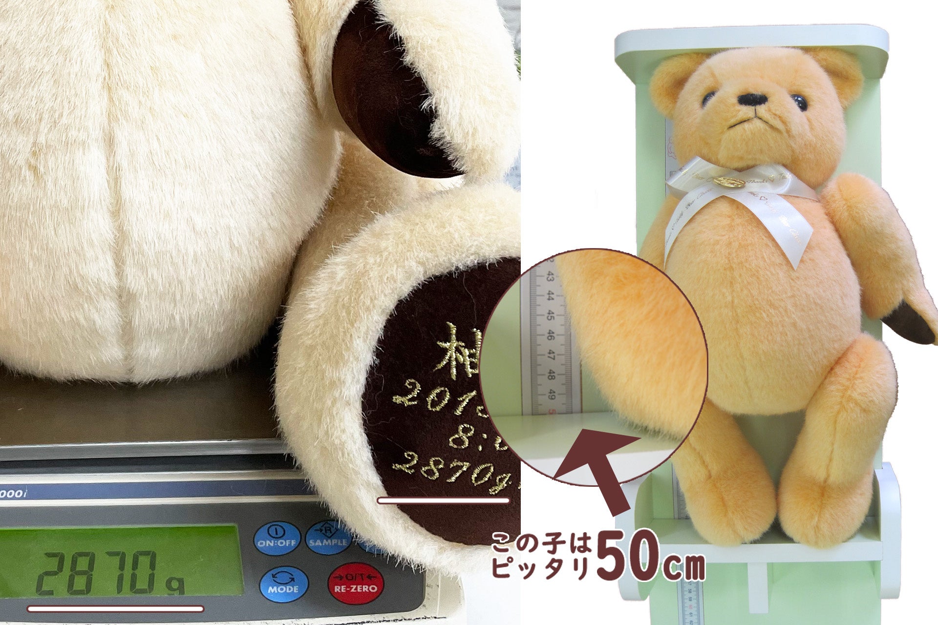 ⾚ちゃん体重テディベアは、⽣まれた時の重さで作られたクマのぬいぐるみ。ウェイトベア/ウエイトド ールと呼ばれることもあります。 新⽣児の平均身長は48.5センチ、平均体重は2.98キロ(厚⽣労働省 乳幼児⾝体発育調査)。ザックリ50センチ、3キロ前後で⽣まれてきますが、おひとり おひとり違いがあります。 その異なる大きさ(身長)、重さ(体重)を1mm・1g単位で再現し、ご希望で、お名前・⽣年⽉⽇、メッセージなどを刺繍する ことで、⻑く愛していただける世界で⼀つだけの宝物になります。